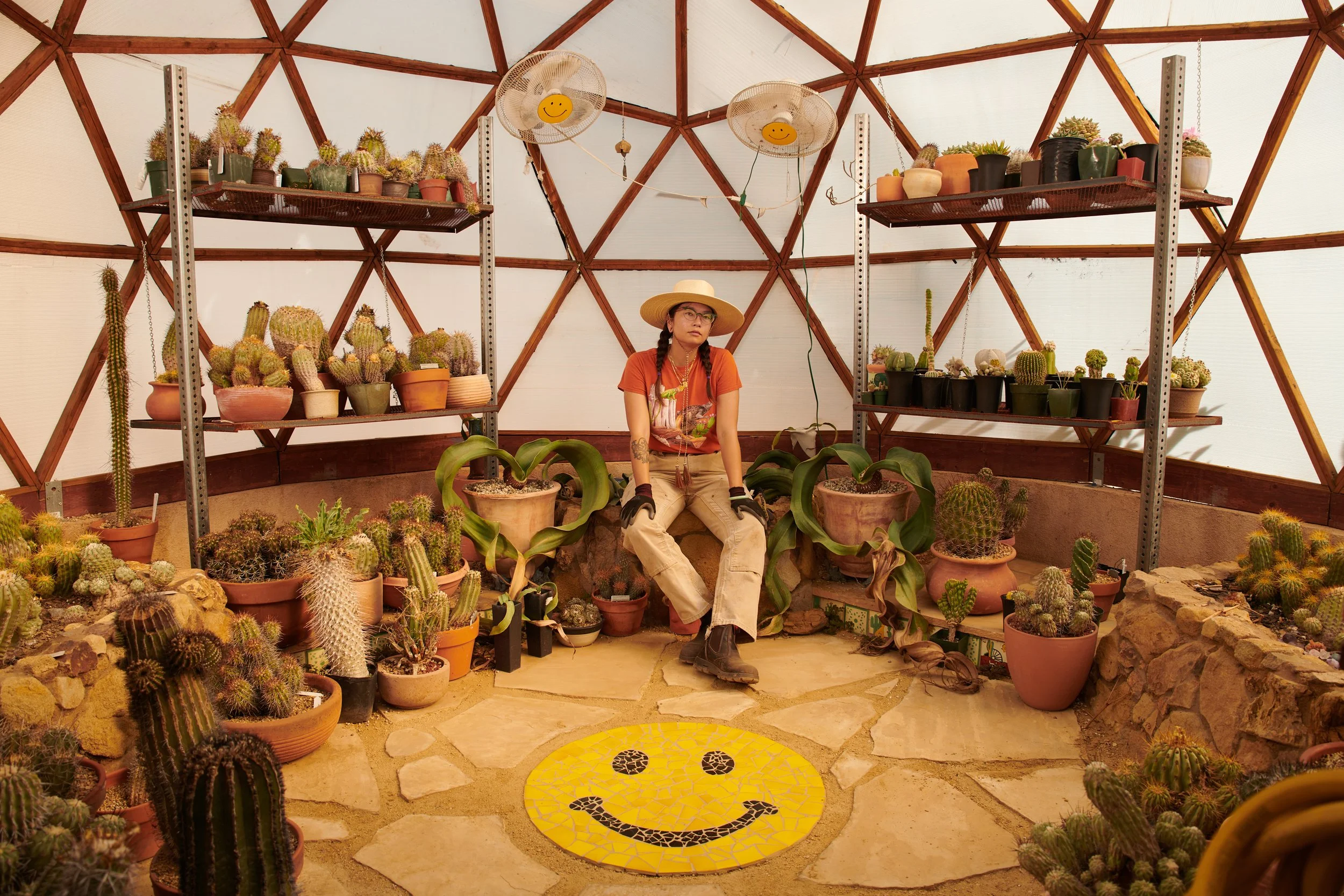 A portrait of a woman in a geodesic dome surrounded by cacti, shot by commercial photographer Linnea Bullion.