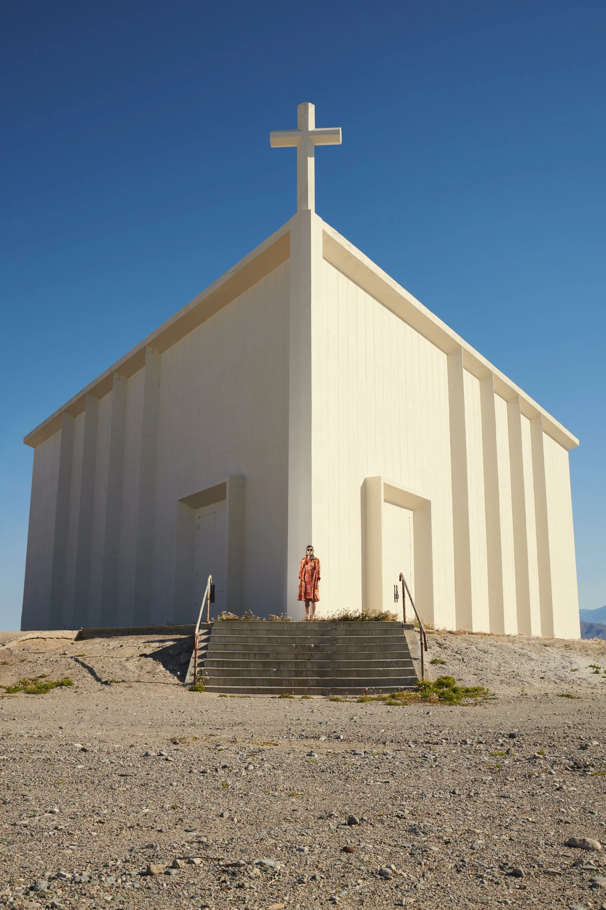 A portrait of a woman standing in front of a giant, monolithic church, shot by commercial photographer Linnea Bullion. View fullsize